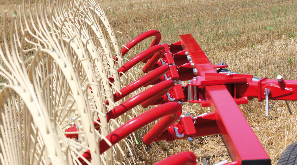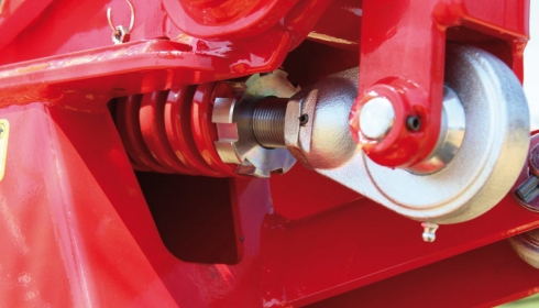 REGULACJA CIŚNIENIA KOŁNIERZOWEGO NA ZIEMIĘ. Każde ramię jest wyposażone w sprężynę skrętną, która może wyregulować nacisk na podłoże w celu optymalnego zbioru i przygotowania pokosu w celu zapewnienia jednolitości podczas pracy.